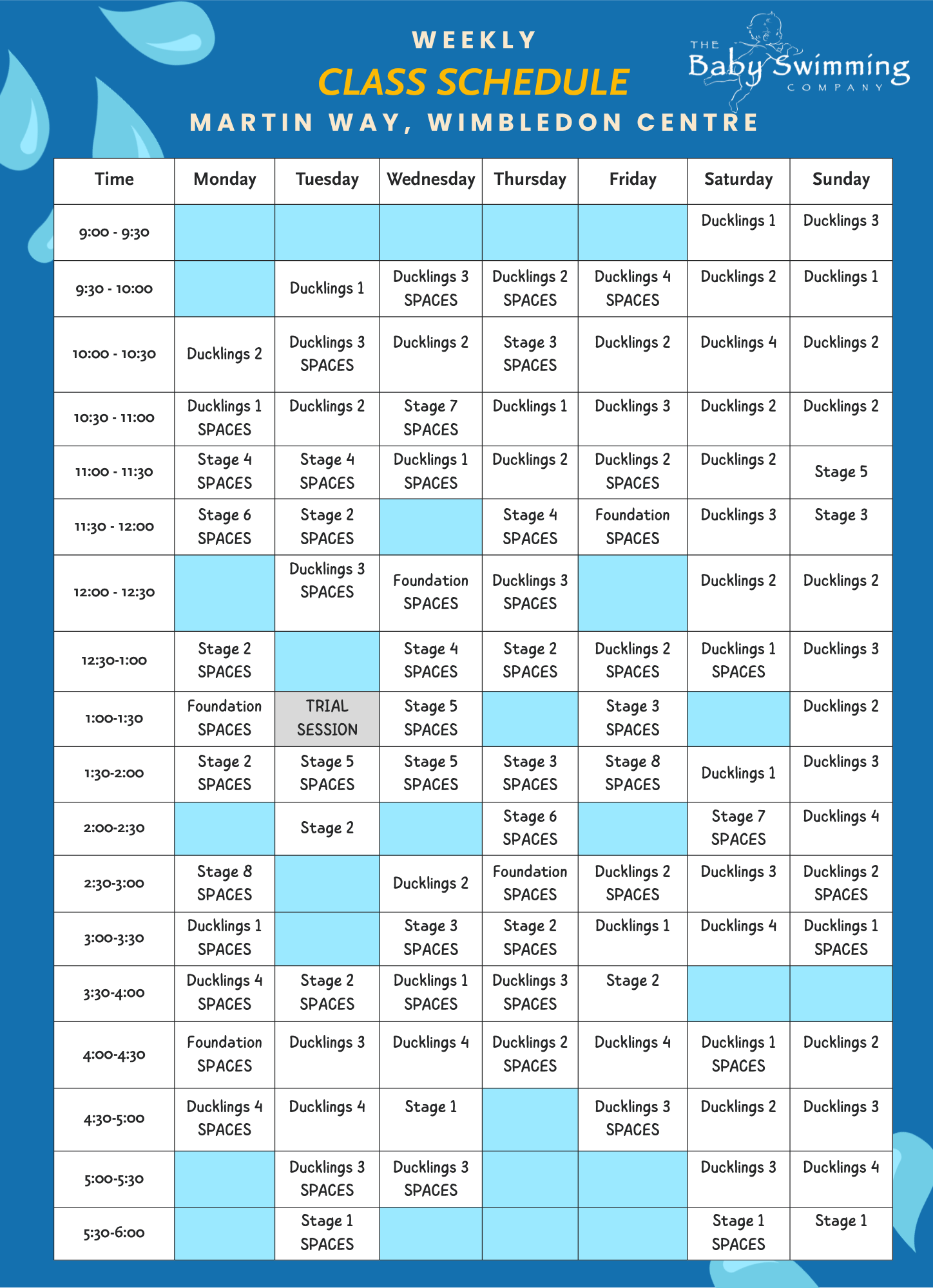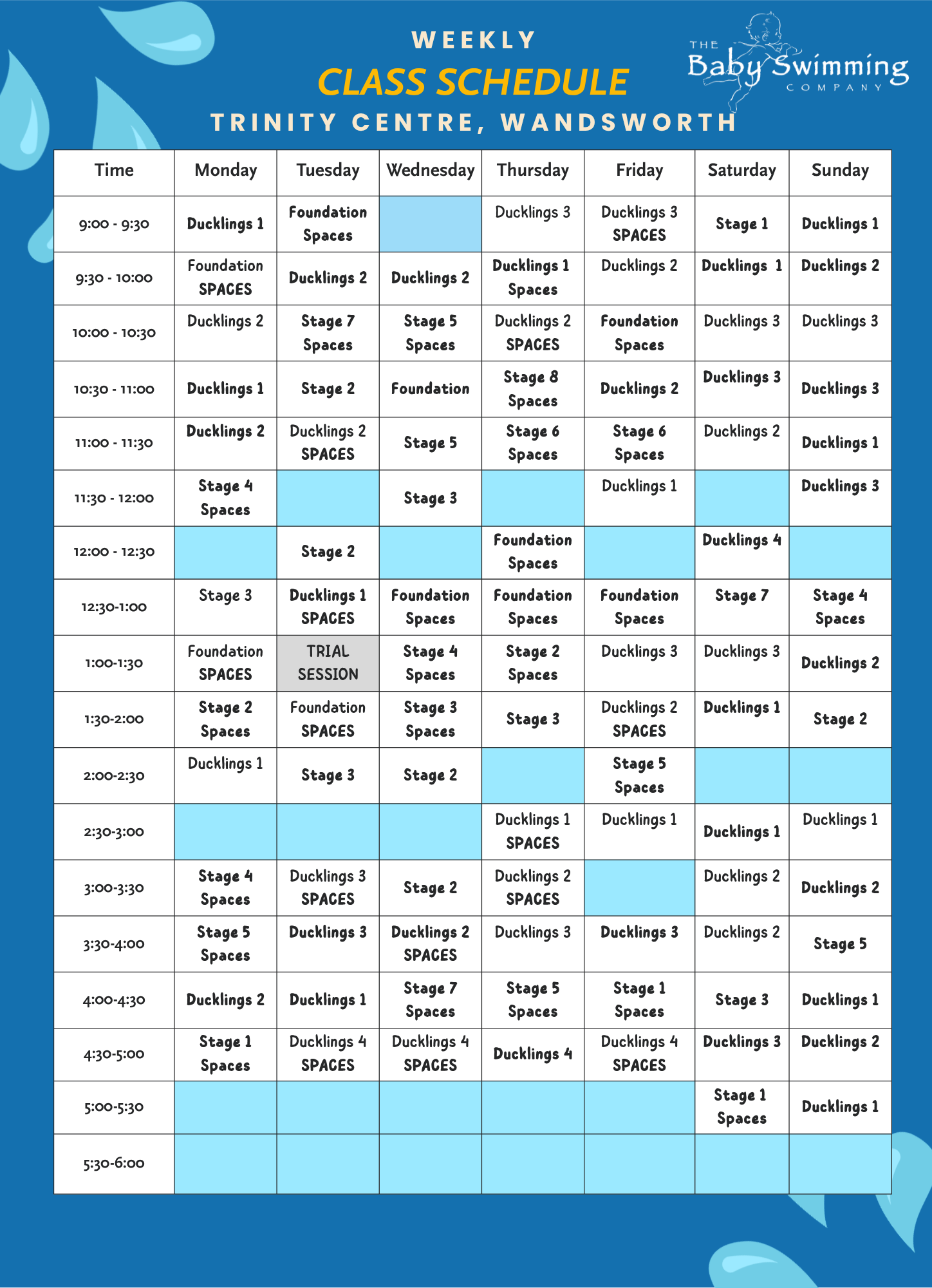 Please note our timetable changes each term to reflect demand and the needs of our little swimmers and their grown-ups. The timetable shown below is the current version and is regularly updated, but it may have changed since the last update. It is provided as a guide to what we offer and what is likely to be available.